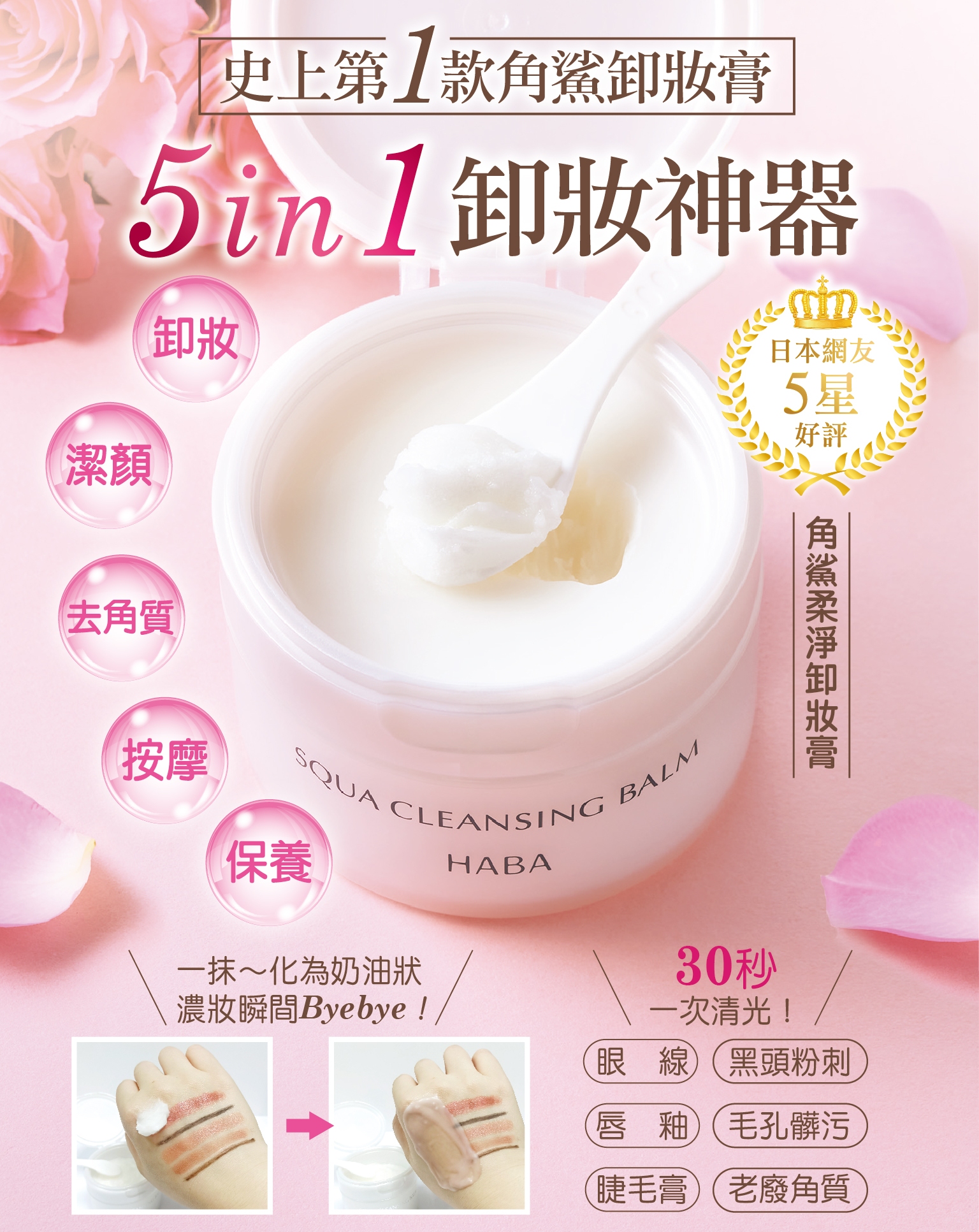 ![]() 就像用精華液卸妝!超奢華淨潤SPA 以HABA明星成分-角鯊,打造史上第一款角鯊卸妝凝膏。新型態的膏狀質地,接觸到肌膚後會瞬間融化為奶油狀,不需用力搓揉,也能輕鬆延展推勻,迅速與臉上的彩妝融合。 ![]() 彩妝瞬間KO,老舊角質Byebye 濃重的眼妝、唇妝也能輕鬆卸除,還能深入毛孔帶走髒污,連老舊角質、討人厭的粉刺也一乾二淨! ![]() 豐富美肌成分,洗後淨透好柔嫩 蘊含天然花果植萃美肌成分,為肌膚留住水潤;優雅玫瑰香,邊卸妝邊享受舒適療癒香氛。 ![]() ♥西洋梨精華:溫和去角質 ♥蘆薈精華:安撫舒緩 ♥橙果皮精華:柔嫩明亮 洗卸2 in 1,旅行好方便 卸妝 × 洗臉一次完成,洗完後不需再以洗面乳洗臉。不用擔心外漏的膏狀質地,旅行外出也能方便攜帶。 相關推薦商品