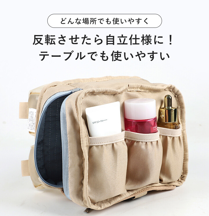 反轉自立:利用內側魔鬼氈反摺即可穩穩站立,變身化妝台上的收納架。
