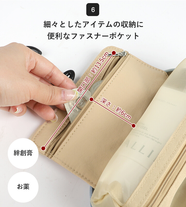 頂層拉鍊口袋:適合存放OK繃、藥品或飾品等細小物品。