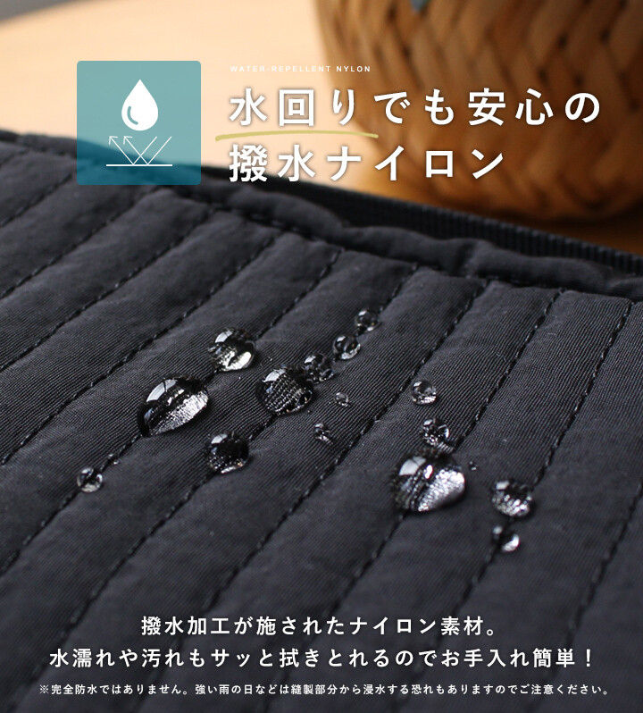 外層採用波浪點點絎縫設計,並具備防潑水加工,即便放在潮濕的浴室洗手台也安心,髒污一抹即淨。
