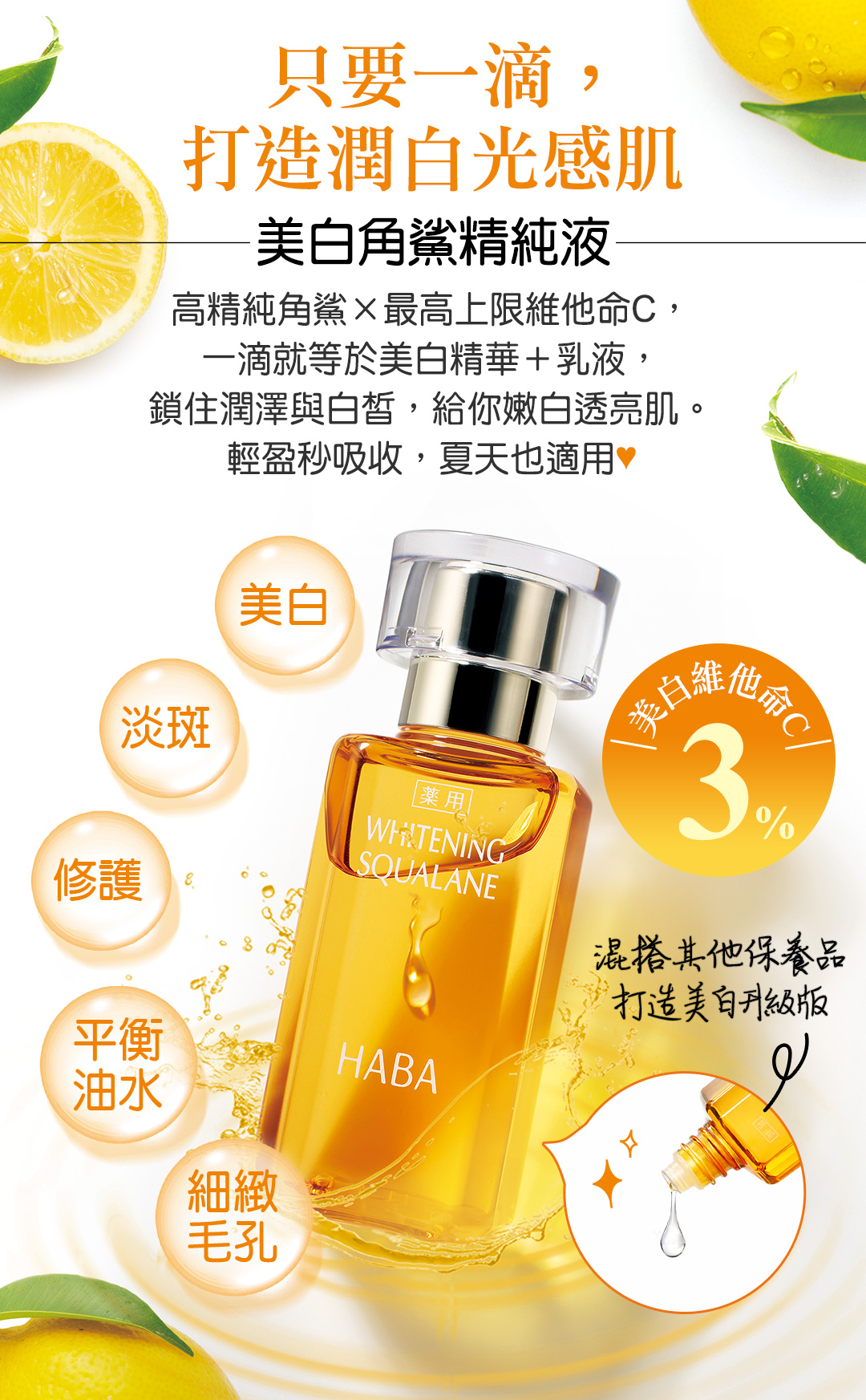 高精純角鯊,搭配維他命C,打造首款美白型角鯊精華。化妝水之後只要一滴,就能取代乳液及乳霜,鎖住潤澤與白皙,讓肌膚閃耀剔透光采!