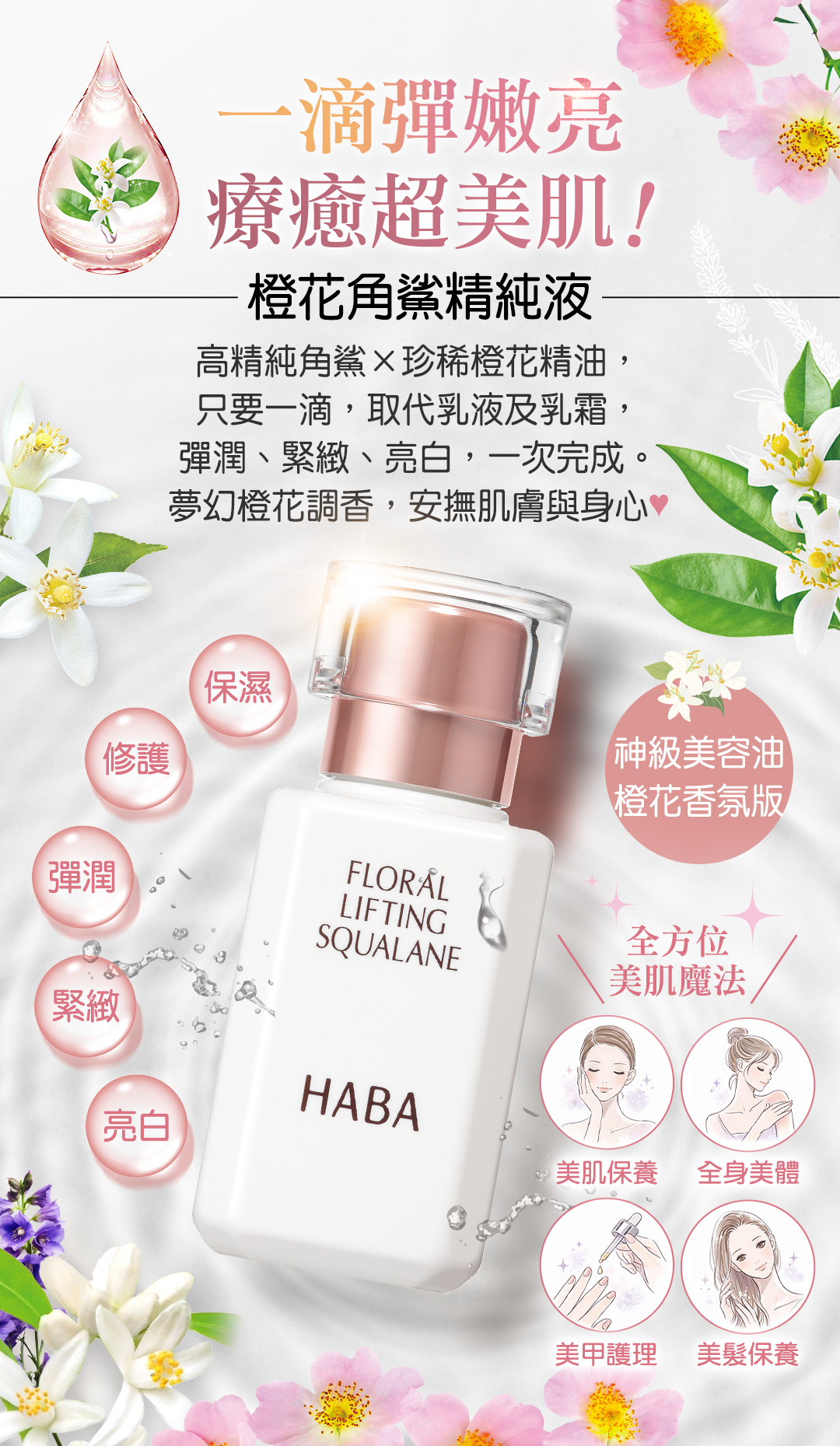 HABA獨家高精純角鯊,搭配珍稀橙花油、野玫瑰與薰衣草,完美調和出如花園般的迷人芳香。邊保養邊享受幸福香氛,安撫肌膚與身心靈。